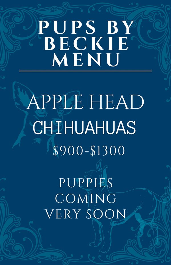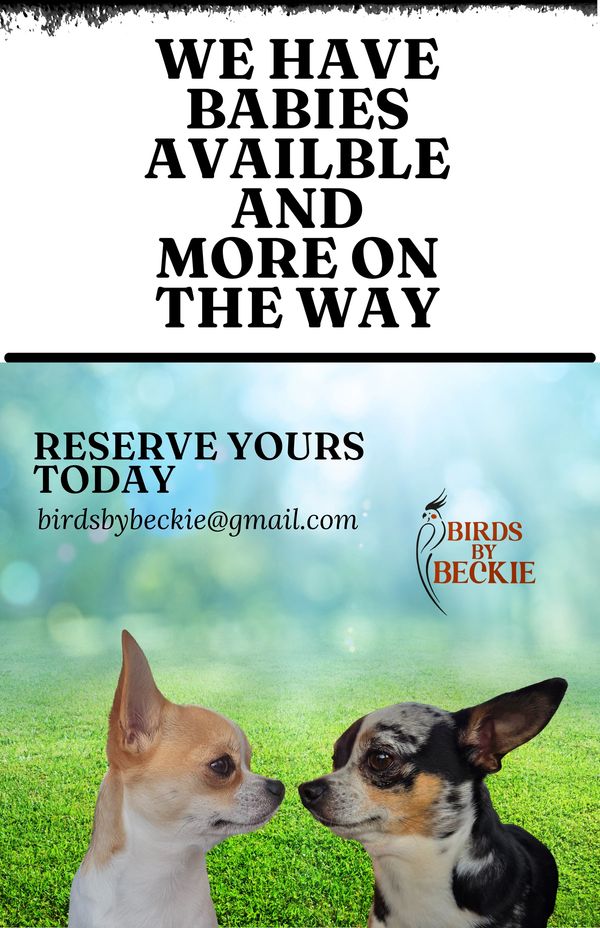 Birds by Beckie offers more than avian companions; we also specialize in purebred Apple Head Chihuahuas. Pictured are our 3-year-old mother, Valentine (in the foreground and father, Leo (in the background). Valentine has successfully delivered three litters to date and is currently pregnant with her 4th litter. Our beloved 1-year-old Bailey is expecting too, (pictured below under our Pups category) and we eagerly anticipate her beautiful first litter. Our puppies are members of our family, and we hold them closely to our hearts. Kindly note that Valentine, Bailey and Leo are not available for purchase.